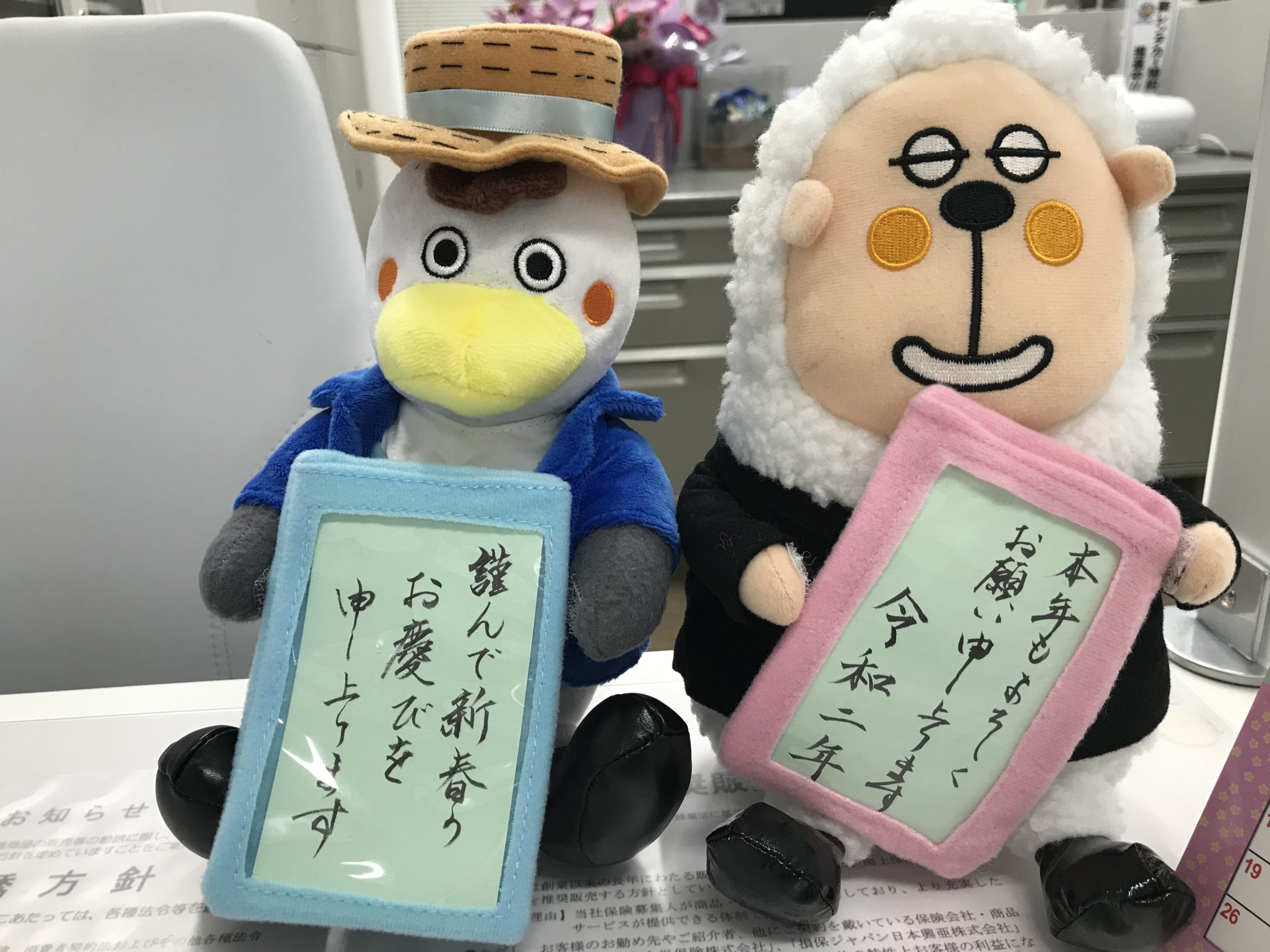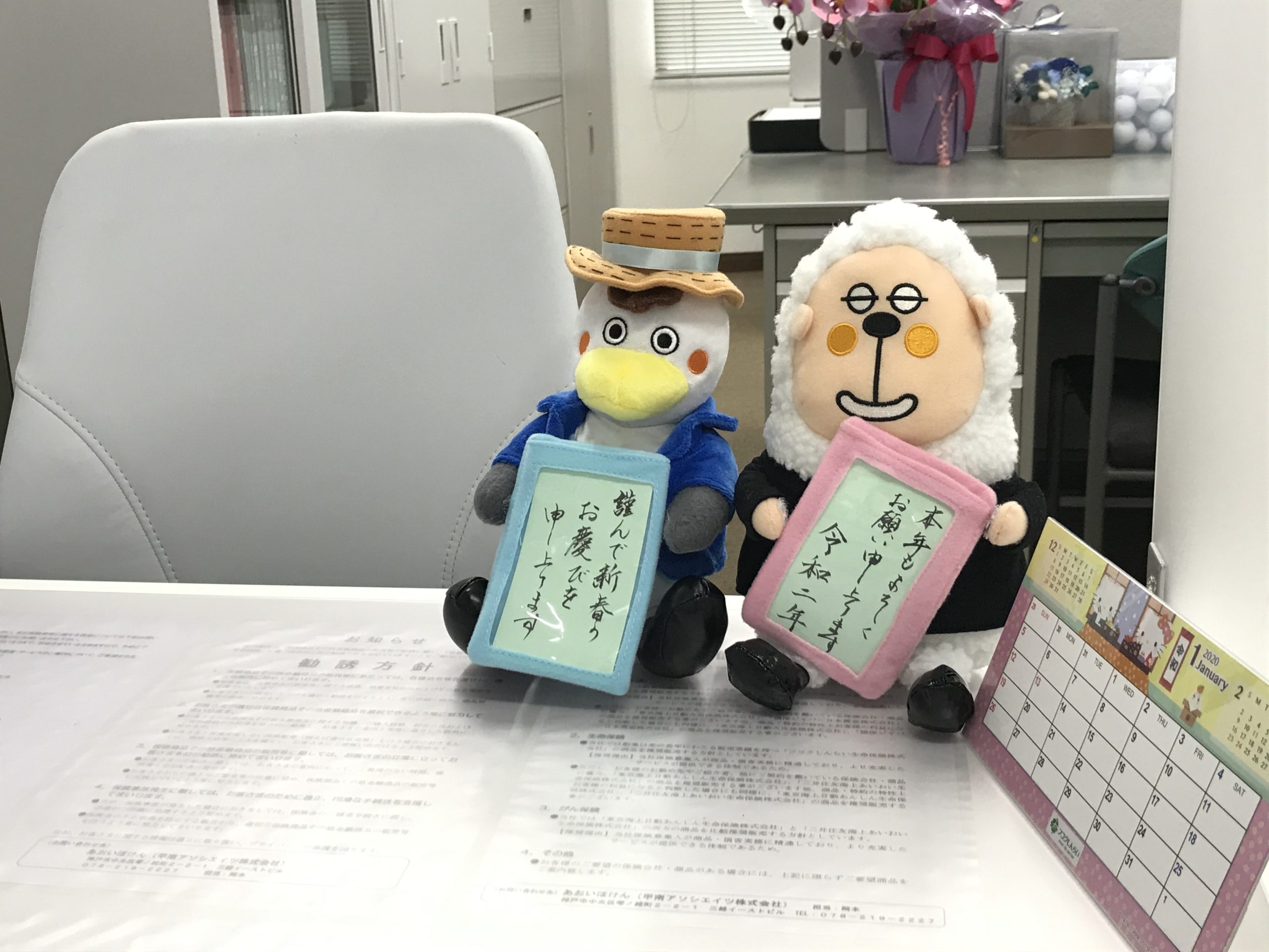 写真は、あおいほけんの保険会社さんへの贔屓等とは一切関係ありませんが、事務主任が上手に年始メッセージを書けましたので、受付カウンターに飾ってみたものです。