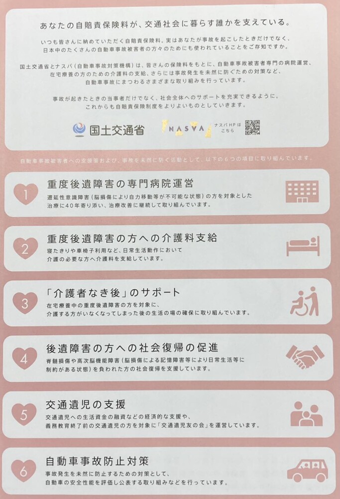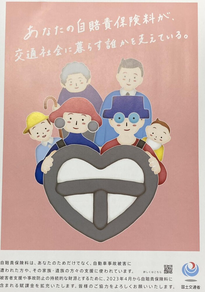 自賠責保険料は、自動車事故被害に遭われた方やそのご家族・ご遺族の方々の支援にも使われていますが、2023年4月から、被害者支援や事故防止の持続的な財源とする為に、自賠責保険料に含まれる賦課金が拡充されています。